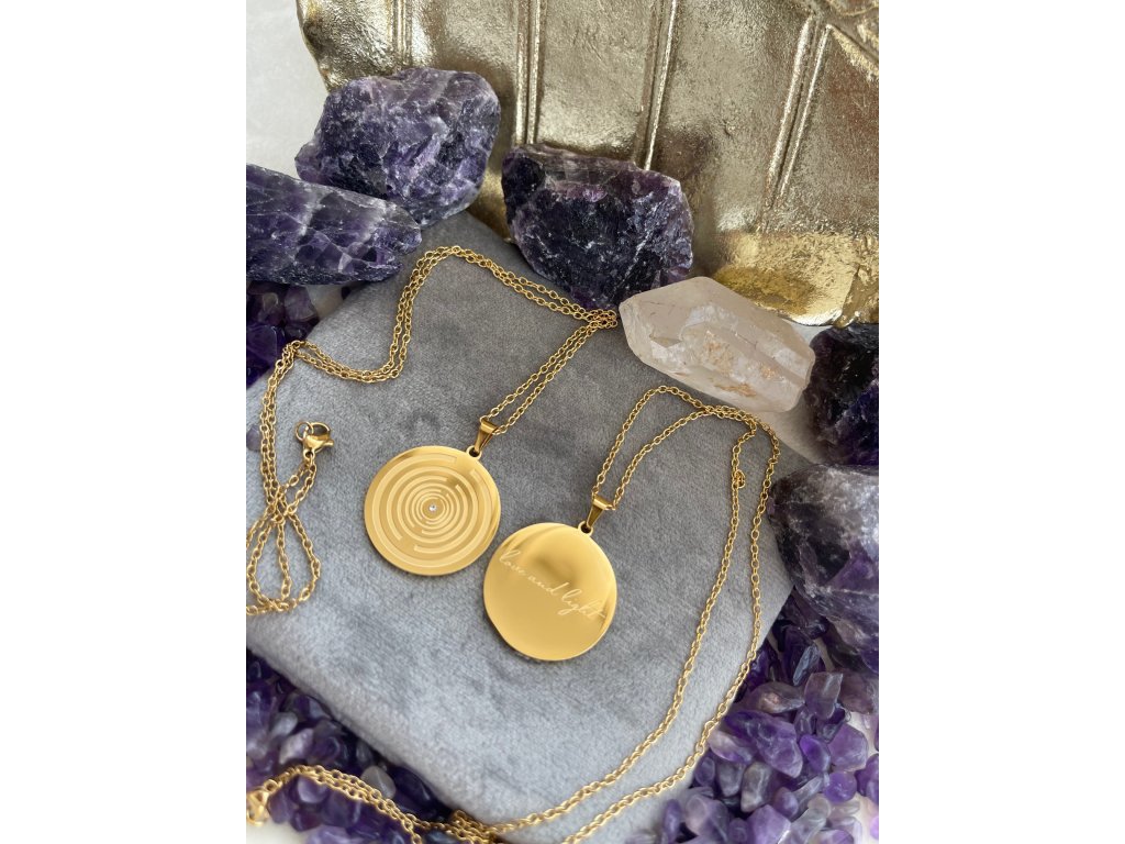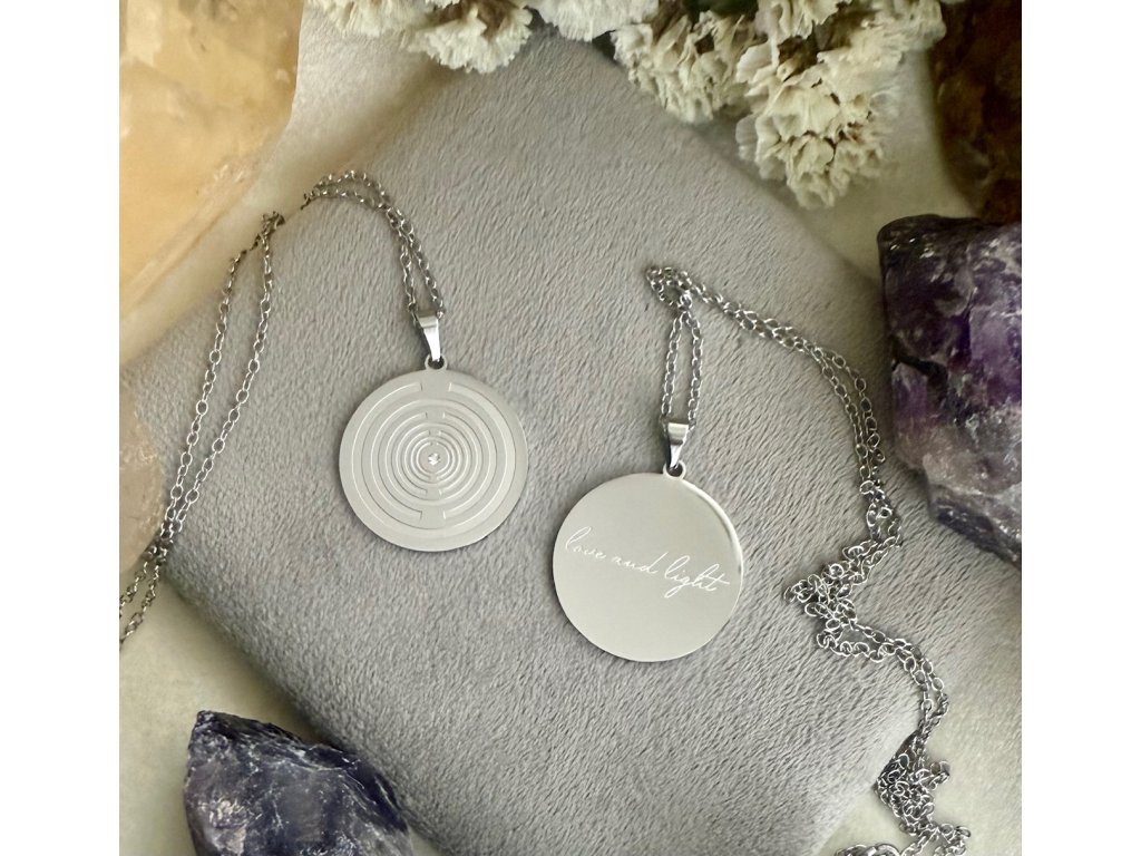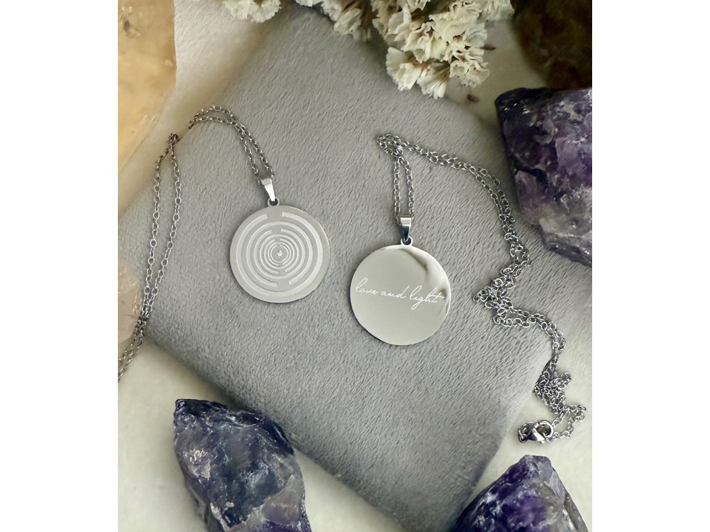 Na zadní straně medailonu je jemně vyrytý nápis „Love and Light“. Tento duchovní záměr symbolizuje lásku a světlo jako transformační síly, které harmonizují vnitřní svět nositele a šíří pozitivní energii do jeho okolí. -